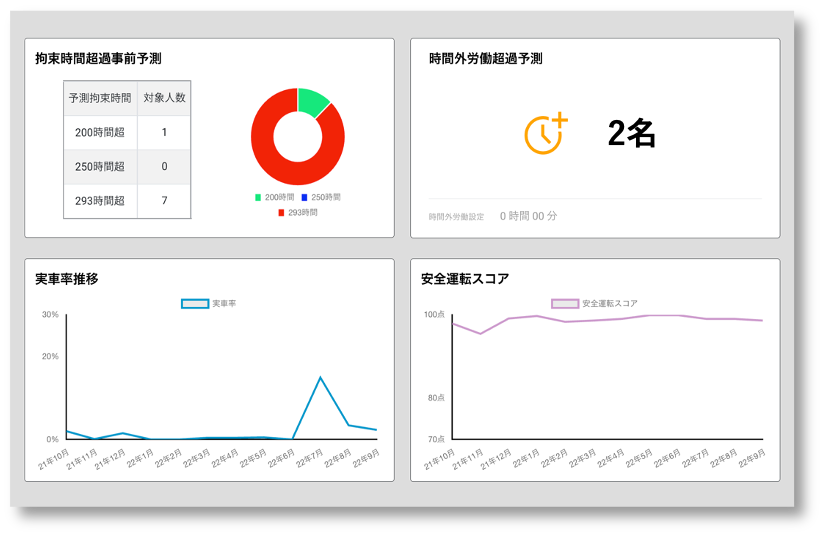 運行管理に必要な情報を集約し、分かりやすいグラフを使って可視化します。ひと目で状況が把握できるので問題点の発見・改善につながります。