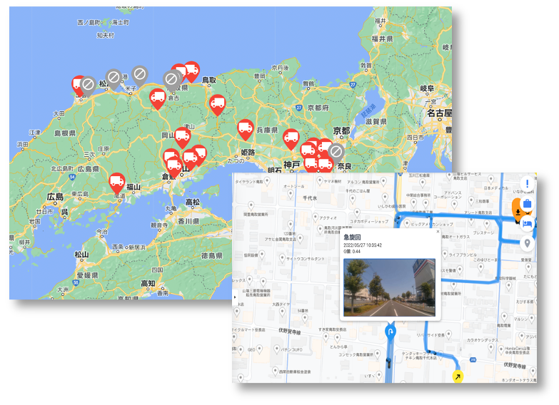 全ての車両の位置情報が地図上に表示されるので、どの車両がどこを走っているのかがひと目で把握できます。荷主様からの到着時間確認にタイムリーな回答ができたり、過去の走行軌跡をもとに配送ルートの改善もできます。
